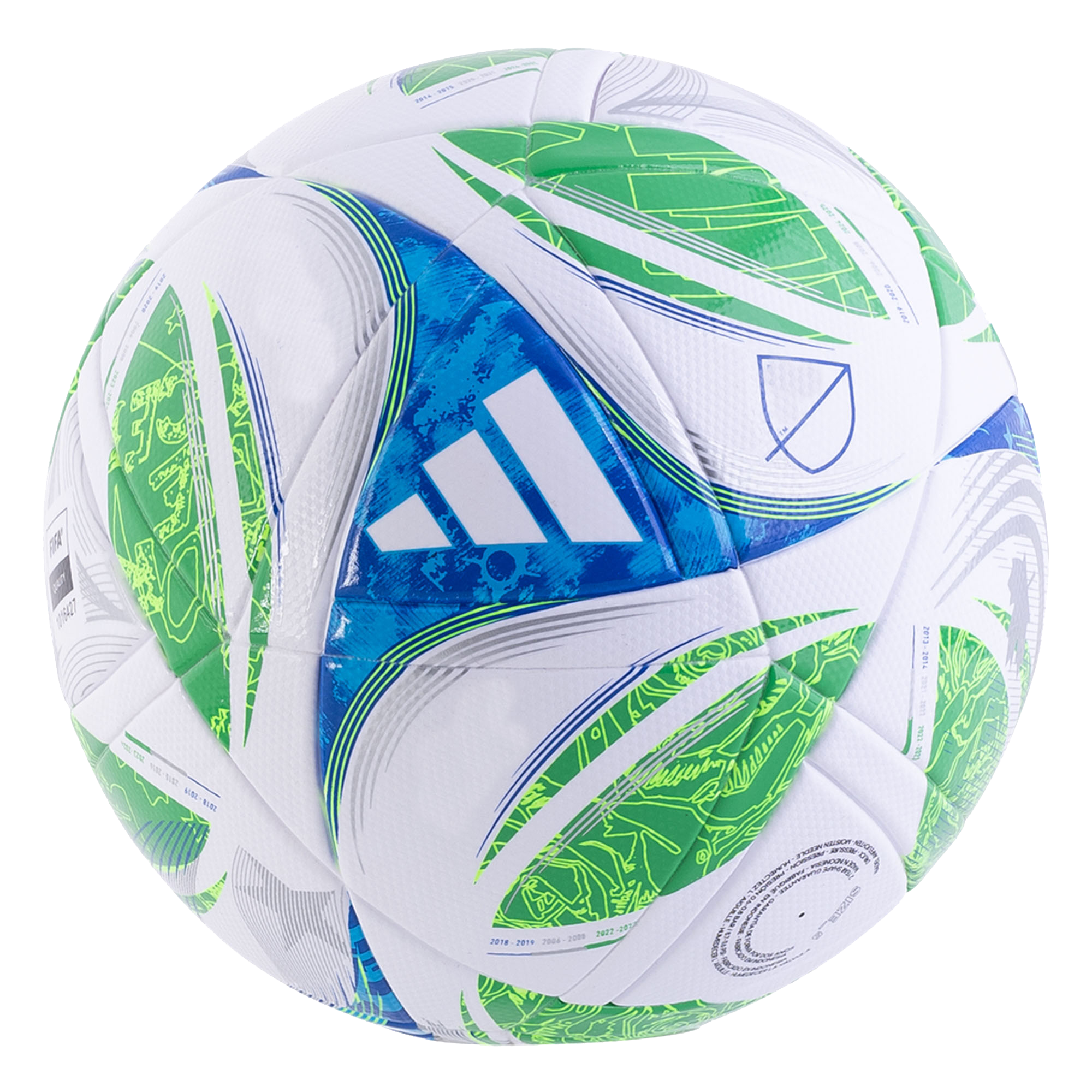 Durable ball for training or matches. Standing out in '96 MLS logo colors, the ball is white with green and blue. The colors were last used for the 25th anniversary ball in 2020.