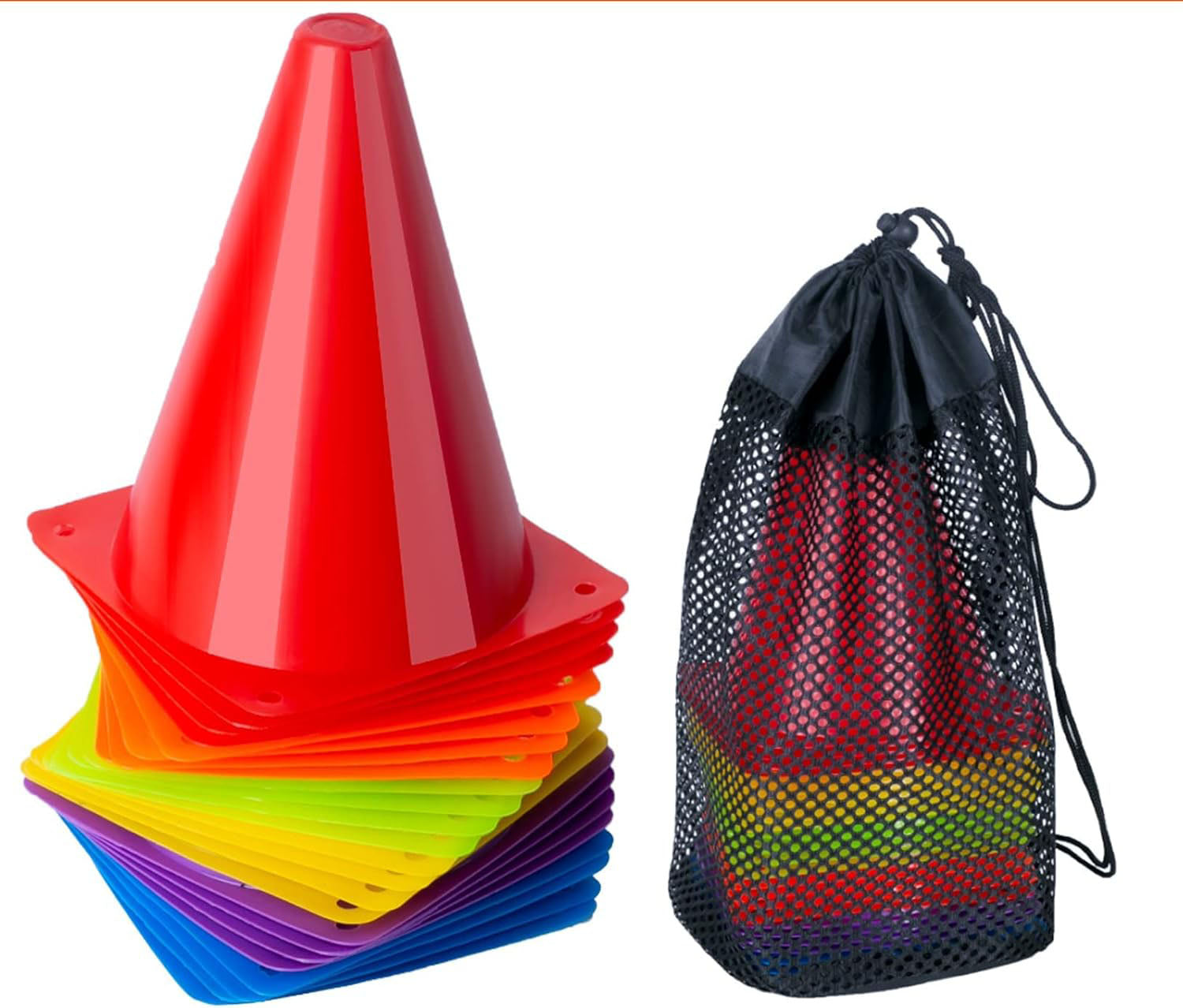 CONTACT US FOR CUSTOMIZATIONThe sport cone set can be used for an assortment of indoor and outdoor activities, such as drills training at soccer, basketball, baseball, games at themes parties and festive events, kids play, skating play, bicycle obstacle course, motorcycle training, race RC cars, parking and maneuverability practice, racetrack marking, dog training, horse training. Designed for use on any flat level surface, such as grass, gravel, pavement, concrete, gym floors,cement,artificial turf and more